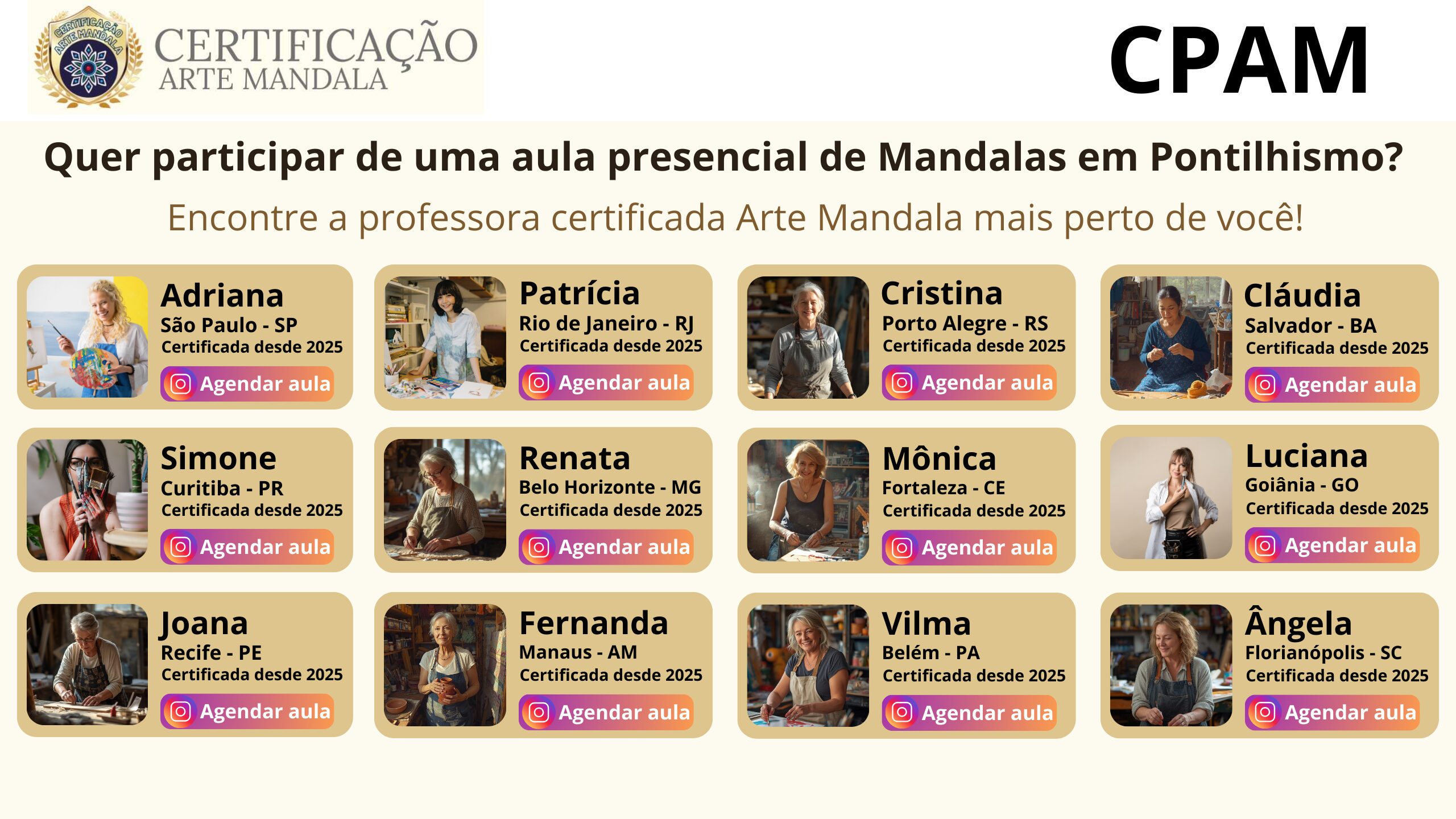 Todos os professores certificados que quiserem receber indicações de alunos na sua cidade, poderão participar do CPAM – Credenciamento de Professoras Arte Mandala, nosso sistema de indicação de professores pelo país.