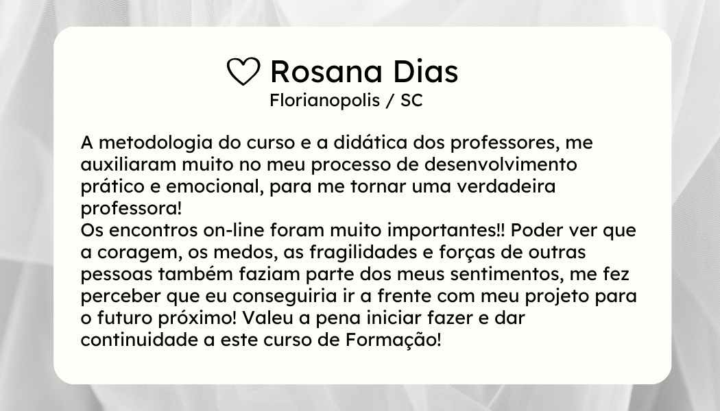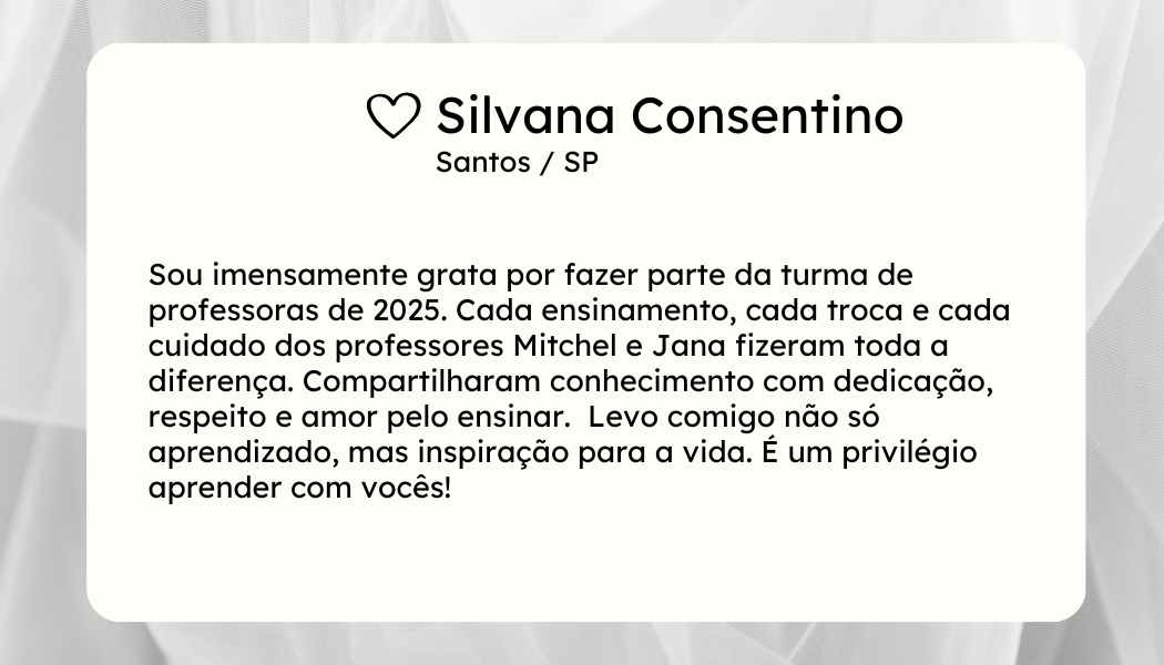 Esse presente exclusivo torna a formação ainda mais transformadora, pois cada professora sai com uma bússola espiritual e prática, capaz de inspirar suas escolhas e iluminar seu caminho como educadora e artista.